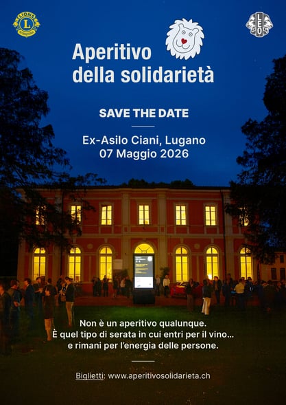 Il prossimo giovedì 7 maggio 2026, all'Ex-Asilo Ciani di Lugano, si terrà l’Aperitivo della Solidarietà , organizzato dal Lions Club Lugano. Un aperitivo pensato per scoprire e degustare vini ticinesi (ma non solo), accompagnati da crudité nostrane e da una selezione di eccellenze del territorio, tra cui salumi, formaggi, dolci e un piatto caldo preparato per l’occasione.